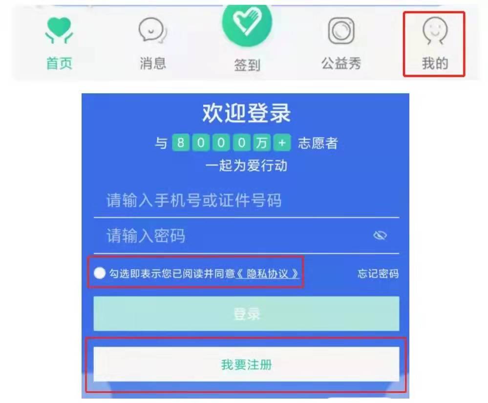 打开“志愿汇”APP点击右下角“我的”,点击“ 我要注册”,按照流程注册成功后即可登录使用。(所有注册志愿者需本人实名注册,登录账号为本人身份证号)